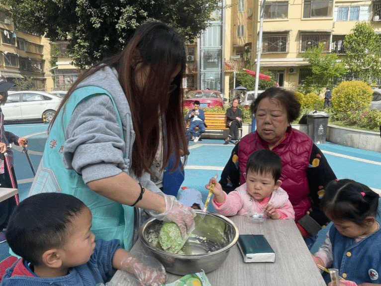 活动在铁门社区银丰园拉开帷幕。居民们陆陆续续到来,现场气氛热烈而充满期待。志愿者们首先为大家进行讲解青团的制作要领,同时一人在一旁演示操作着:将预拌粉缓缓倾入盆中,加入适量清水,经过一番细心揉搓,一个色泽鲜亮翠绿、质地柔滑细腻的面团便跃然眼前。紧接着,志愿者们将面团分成若干小块,包裹进馅料,再轻轻揉搓成圆润可爱的青团。居民们见状纷纷竖起大拇指,对志愿者的手艺表示赞赏。过程中,小朋友们更是跃跃欲试,在志愿者们的陪伴下,一板一眼地模仿起来,捏出各式各样的可爱作品。活动现场洋溢着欢声笑语,空气中弥漫着青团独有的香甜气息,这份甜蜜与欢乐交织在一起,充满了整个活动区域,让每一位参与者都沉浸在这份温馨与美好之中。
