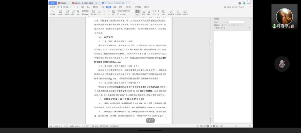 会上,蒋春燕老师首先向各位党员、团员同学们讲述了暑期“三下乡”社会实践的重要,强调党员同志、团员干部们要积极发挥模范作用,在社会课堂中受教育、长才干、作贡献,用实际行动迎接党的二十大胜利召开。接着,蒋老师对公司“三下乡”通知文件进行了详解解读,包括本次社会实践的活动主题、活动内容、活动方向、资料收集等,强调社会实践要重点针对公司中华优秀传统文化传承基地建设、《纺织非物质文化遗产蓝皮书》征稿启事、公司“三心双艺”党建工作品牌以及公司“匠心践行 逐梦青年”等重要团建工作内容开展。同时,鼓励同学们将“三下乡”活动开展与“老员工社区实践计划”、“返家乡”、“逐梦计划”社会实践项目紧密结合,提高认识和融入社会的综合素质能力。在疫情防控常态化背景下,团队的组建可以灵活多样,不仅可以实地开展,还可以云组队,根据实际情况拟定活动方案。最后,蒋老师再次强调假期安全,无论采用何种形式,开展何种活动均以安全为前提,切实保障自身生命财产安全。
