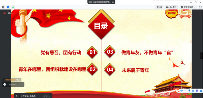 会上,蒋春燕老师带领团学干部们学习习近平总书记系列重要讲话精神,从“党有号召,团有行动”、“青年在哪里,团组织就建设在哪里”、“做青年友,不做青年‘官’”以及“未来属于青年”这四个板块引导团学干部深入学习讲话内容,树立正确的世界观、人生观、价值观,坚定“主心骨”,补足“精神钙”,筑牢“压舱石”。期间,蒋老师对疫情时期公司团学干部纷纷响应号召,积极主动参与公司、家乡等地的防疫抗疫工作表示高度肯定,发挥了团学干部的模范带头作用,树立了良好的榜样形象。此外,她着重强调了团学工作的开展不能脱离青年同学,要从同学中来到同学中去,以先锋队服务员的角色完成各项任务。同学们在理论学习期间,也要不断加强实践锻炼,用追求卓越、不断创新、精益求精的工匠精神涵养时代气质,激励自我坚定前行。同时,要求广大团员干部继续深入学习总书记讲话,更加紧密团结在以习近平同志为核心的党中央周围,勇做时代的弄潮儿,成为祖国建设发展坚不可摧的力量。
