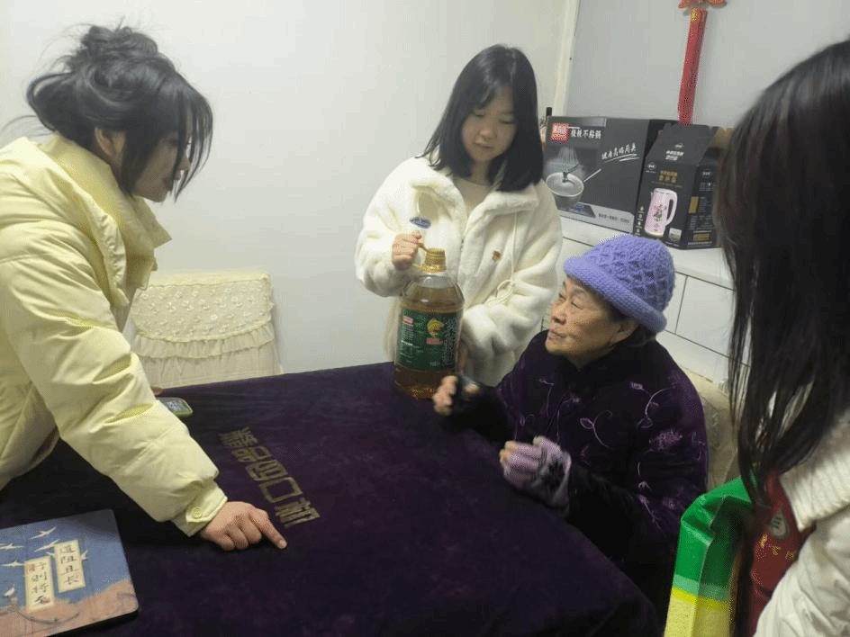 活动开始前,党团青年在社区工作人员以及社工老师带领下,详细了解了各位老党员及困难家庭的基本情况。在老党员赵玉华同志家中,同学们亲切的询问老人家的身体情况和生活状况。老人家对学子们的亲切关怀也一一答复,同时聆听赵玉华同志畅谈年轻时的拼搏奋斗及入党时的荣耀自豪。随后,员工党员代表向其送上菜籽油和大米等慰问品。老人家在接过慰问品时感动不已,表示有党和政府组织的暖心关怀,老百姓的日子会越过越好,叮嘱同学们要好好学习,成长为祖国需要、人民需要的栋梁之才。