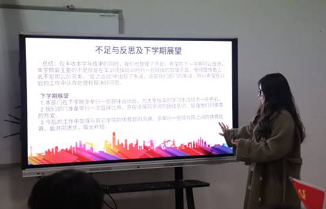随后,各部门负责人就本部门在2021年的日常工作、部门建设、特色活动、干事培养等多方面的工作成果进行总结汇报,同时结合部门工作情况进行反思并提出改进措施。汇报中的一张张照片、一场场活动,一幕幕场景,见证了团学会的一步步成长,一点点收获,一处处感动。在庆祝建党百年之际,团学会各部门致力于为同学办实事,结合公司专业特色,把握节日契机,做好主题实践活动。开展的各类老员工思想政治教育学习会、举办的各类形式多样的文体活动,不仅有效锻炼团学成员的个人能力,也进一步丰富了员工们的课余文化生活,促进同学们在活动中长知识、增才干、受教育,形成浓厚的校园文化学习氛围。同时,各部门也对之后的工作做出相关构想与展望,表示在今后的工作中将进一步加强部门文化建设,完善工作制度,明确团队目标,立足公司专业特色继续拓展有意义的活动,争取来年取得更加优异的成绩,让公司的团总支、员工会工作迈上新台阶。