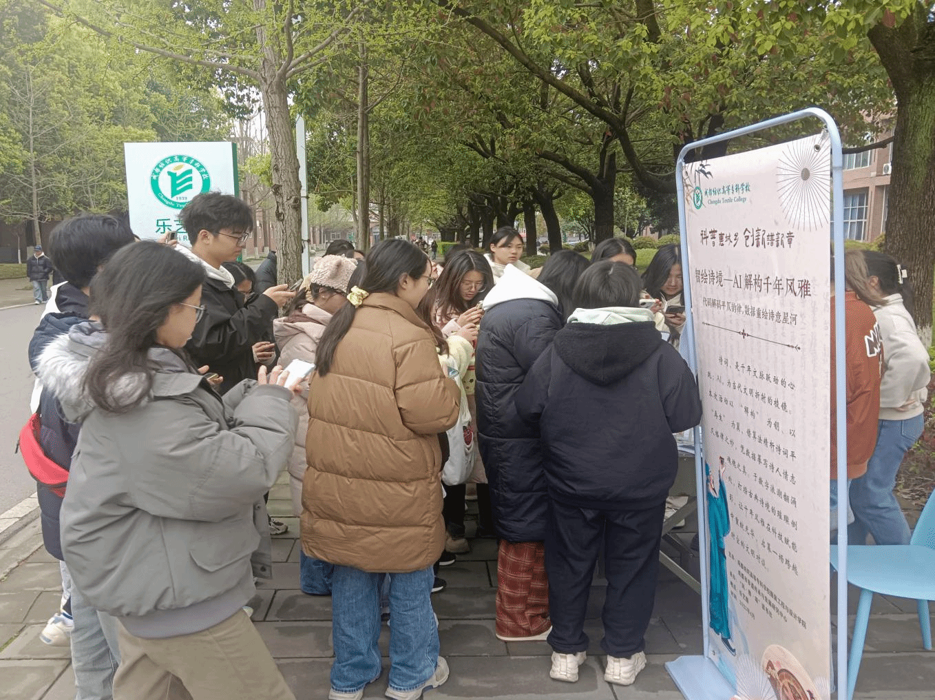 4月4日下午,北苑乐艺路热闹非凡,一场洋溢着诗意的文化体验活动在此盛大举行。由“风・雅・颂”读书社精心策划的“智绘诗境——AI 解构千年风雅”主题活动正式拉开帷幕,现场氛围热烈,吸引了800余名学子前来参与,共同沉浸在这场诗词与文化交融的盛宴之中。