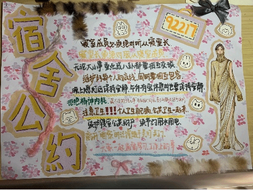 比赛前期通过网络宣传,在同学间收到良好反响,同学们积极踊跃的报名。寝室成员共同探讨、制定符合自身特色的寝室公约。这些公约不仅涵盖作息时间、卫生值日等日常规范,还融入独特的寝室文化理念,充分展现出同学们的团队协作精神与创新思维。比赛作品经由公司老师从色彩、公约内容、设计风格等方面进行综合评定,评选出一等奖1份、二等奖2份、三等奖3份个和优秀奖7份。