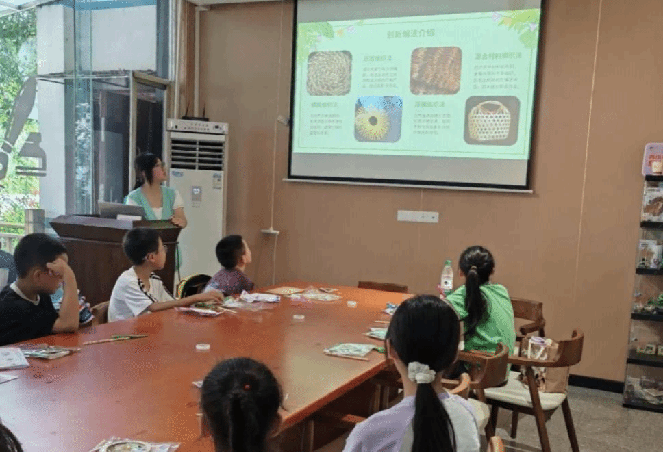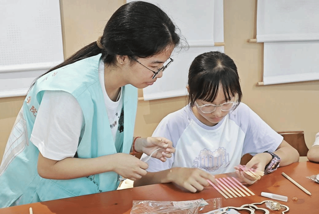 活动伊始,志愿者们提前半小时抵达现场,相互协作,布置桌椅、分发材料、调试设备,确保流程顺畅。随着孩子们陆续到场,活动正式拉开帷幕。志愿者王春宜首先通过精心准备的PPT,生动讲述了竹编技艺的千年历史与文化脉络。随后,一段行云流水的教学视频将理论与实践巧妙衔接,瞬间点燃了孩子们动手创作的热情。紧接着,实践环节正式开始,志愿者们耐心引导孩子们,或悉心纠正编织手法,或协助固定竹篾造型,或引导搭配彩绳与铃铛。在志愿者的帮助下,零散的竹篾与配件逐渐化身为一个个精巧别致的竹编风铃。孩子们全神贯注,脸上洋溢着成功的喜悦,清风徐来,清脆悦耳的铃声此起彼伏,仿佛奏响了传统工艺的动人乐章。