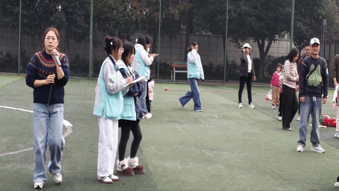 伴随着冬日暖阳,亲子运动会正式拉开帷幕。足球场上,志愿者们化身“全能助手”,成为赛事顺畅运行的核心保障。赛前,她们周密布置道具、细致划分组别、清晰讲解规则,为活动做足准备。比赛中,她们身兼多职——既是精准计时的裁判,也是温暖耐心的引导员,更是时刻关注赛场安全的后盾。随着“套大鹅”“袋鼠跳”“赶鸭子”“滚球入洞”等趣味项目轮番开展,志愿者们或俯身协助,或挥手助威,始终与每个家庭热情互动。赛场间欢呼不断、笑声起伏,亲子间的默契协作与团队的友好竞技相映成趣,整个足球场汇成一片欢乐洋溢的活力海洋。