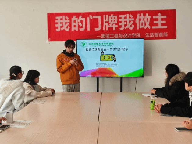 12月5日中午,公司在织锦楼E212教室举行了“我的门牌我做主”比赛颁奖会。生活督查部负责人、干事及获奖寝室员工代表共同参加。会上,生活督查部负责人依次为获奖同学颁发奖项。随后,一等奖获奖寝室代表分享了其门牌的设计理念与创作过程:“我们的门牌设计采用了服装设计专业的特色,将门牌的形式设计为一块块‘布’连接起来的,大量的使用了缝线的设计,加深了本专业的特色,其中一个‘1’被替换成拉链半拉开的形象,增加趣味性和象征性,图中还有缝针和顶针的设计。图中的两个男孩代表着我们男寝的身份,两人之间的说笑合作代表着我们和平共处的寝室氛围。”