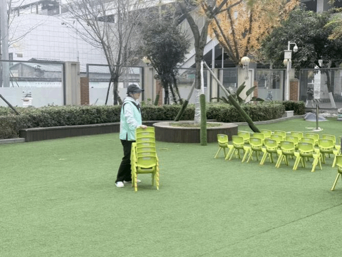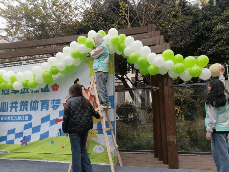 活动伊始,志愿者们便迅速投入工作,大家分工有序、默契配合。有人化身“搬运能手”,将塑料凳、儿童座椅等物资高效归置,依规划摆放整齐;有人担任“创意设计师”,于梯架上巧手搭建绿白交织的气球拱门,顷刻间童趣弥漫,氛围倍显温馨;还有人细心检视场地、清理杂物,确保每一处细节安全整洁。寒风虽劲,热情不减。他们忙碌的身影构成园中一道亮丽的风景,最终以细致的筹备与满腔的热忱,圆满完成了活动场地的布置工作。