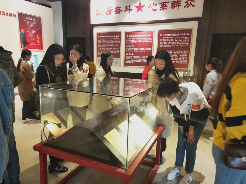 “麦苗儿青来菜花儿黄,毛主席来到咱农庄,千家万户齐欢笑,好像那春雷响四方……”刚踏入展厅,党员同学们听到了两位奶奶唱着一首红歌——《毛主席来到咱农庄》,一首歌勾起了60年前毛主席视察红光的故事:1958年3月16日,毛主席来到郫县红光,视察当地农业合作社。转眼60年过去了,红光镇从一个农耕小乡,发展成为今天富足繁荣的现代活力小城镇,听着歌,想着如今的幸福生活,更是激励了同学们要不忘初心,铭记历史,坚定理想信念,以实际行动践行党的宗旨。