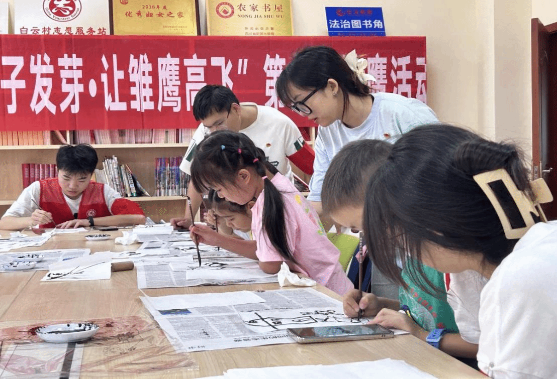 7月11日,威廉希尔体育“风·雅·颂”读书社“锦绣书韵”暑期“三下乡”社会实践小分队带着对中华传统文化的热爱与传承之心走进白云村社区,开展了一场别开生面的听党员讲初心故事之书法字画活动。