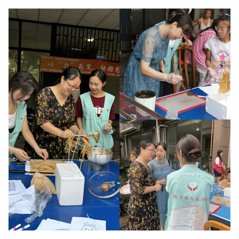 7月11日,威廉希尔体育“匠心织梦”社会实践团队前往五粮社区开展“以勺为笔,融糖为墨”非遗技艺传承体验志愿服务活动。通过非遗糖画体验,将中华优秀传统文化、非遗技艺带入日常群众生活中,让居民们近距离感受民俗文化的趣味和魅力,学习传承宝贵的非遗文化遗产。此外,活动将糖画与服装服饰知识巧妙结合,培养青少年对文化艺术、服装服饰的兴趣以及审美创造性。