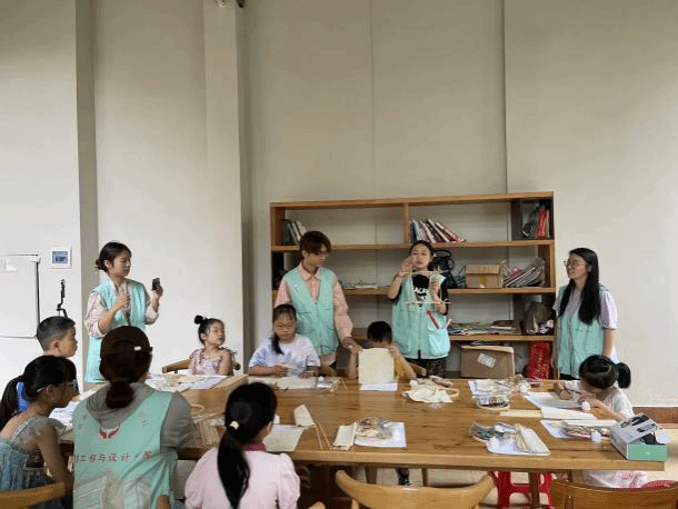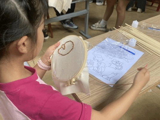 蜀绣,又名川绣,为“中国四大名绣”之一,被誉为“蜀中瑰宝”,以其明丽清秀的色彩和精湛细腻的针法形成了自身的独特韵味。花灯,又名彩灯、灯笼,既具生活功能又有艺术特色,是一种重要的传统手工艺品。非遗蜀绣与花灯的碰撞,带来不一样的文化火花。活动开始,团队成员李秋静和王佳蓉以蜀绣文化背景、历史由来、针法技艺等相关知识为切入点,随后延伸至本次实践内容,讲解刺绣和花灯详细制作步骤,在志愿者们的帮助下,小朋友们对照着提前准备好的工具和小图案,开始动手制作,有的全神贯注搭起棚架耐心刺绣,有的专心致志创作花灯框架,还有的帮助大家进行粘贴,活动过程中小朋友们兴致勃勃、踊跃参与。动手过程中一个个问题接踵而至,志愿者同学们温柔地耐心解释,现场热闹非凡。