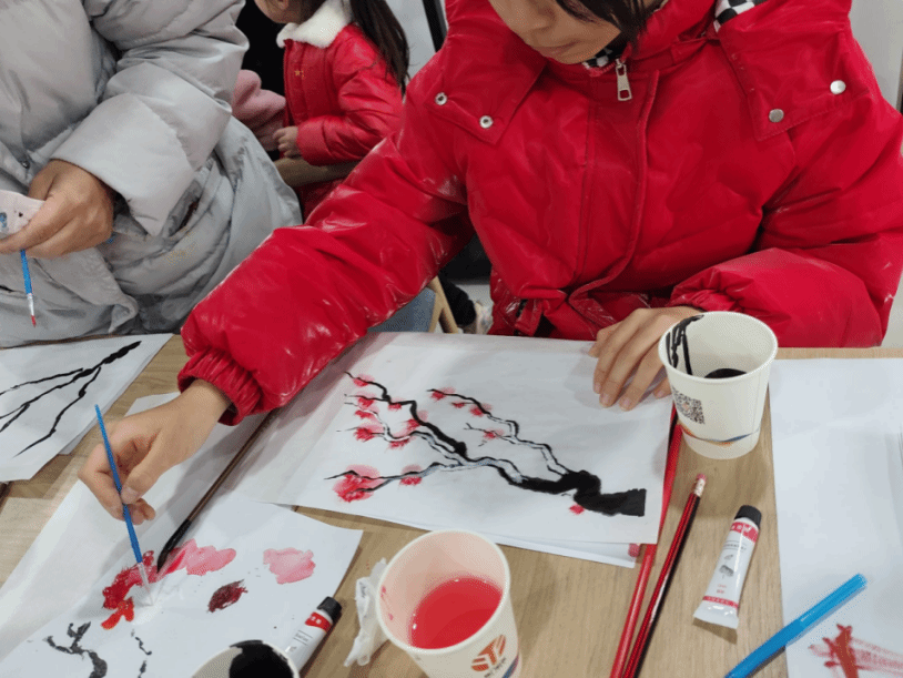活动当天,志愿者们早早便来到现场,布置场地,分发所需物资。活动开始,张心圆同学首先耐心地向居民们讲解了关于冬至的民俗知识,大家兴趣盎然,积极进行问答互动,现场气氛非常活跃。紧接着进入“画九消寒过冬至”的水墨绘画阶段,小朋友们踊跃参加,认真地在宣纸上描绘着自己心中的冬日之景,志愿者哥哥姐姐们则在一旁耐心地指导,帮他们调色,整理物品,向小朋友们分享自己的经验。画纸之上,每一笔都倾注着专注与思考,每种颜色都跳跃着活力与欣喜。活动进入尾声,小朋友们相互欣赏彼此的作品并合影留恋,大家脸上都洋溢着自豪的笑容。