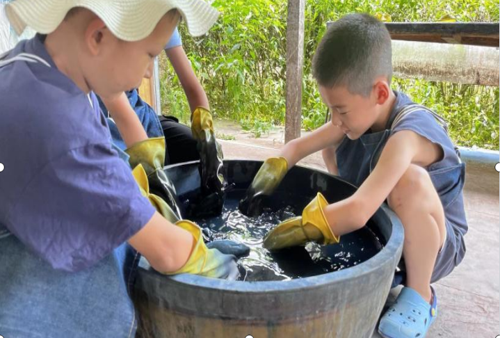 期间还有宝妈带孩子来体验“草木染”的,有的小朋友染T恤 ,有的染玩偶,小朋友说“一样的扎染方法,每个人做出来的成果也都不一样,每个人做的都是独一无二的。”