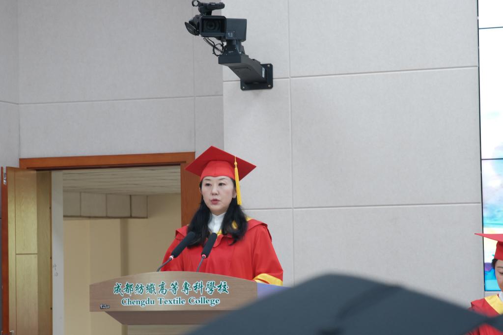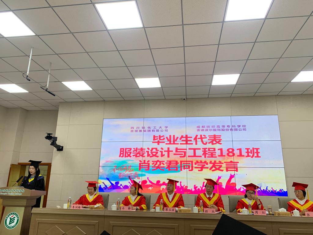 毕业生代表、2018级服装设计与工程专业肖奕君在发言中表示,母校是我们引以为傲的精神家园。每个人的光芒在这里汇聚,成就两校的光荣。青春是有限的,但奉献是无限的。一朝同窗,不说再见,一日为师,终生不忘,母校如家,眷恋不舍,强国有我,不负青春。我们将勇往直前,担时代使命,传承青春事业。