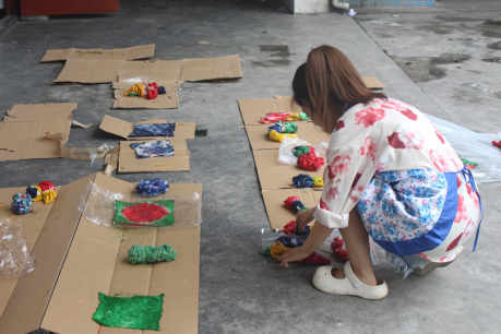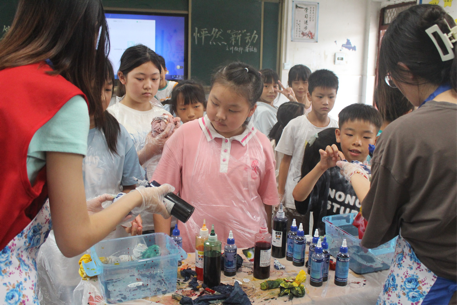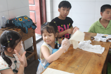 在正式扎染前,团队成员们先拿出了提前准备的方块白坯布,鼓励小朋友们先进行练习,在大家有了第一次实践经验之后,再让小朋友们将各自的衣物进行扎染。期间,团队成员们手把手的对小朋友展开教学,颜色的搭配,图文的装饰,制作的步骤等。小朋友们发挥想象,依据各自的喜好,一件件独一无二、别具一格的扎染服装新鲜出炉,也在大家欢声笑语中结束了当日的学习。