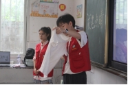 活动伊始,团队成员利用PPT以及视频等教学资料开始服装扎染的课程宣讲,向小朋友们介绍了中国历史上扎染的来源和传说故事,讲述扎染在当今时代背景下的发展和传播,并且现场演示了扎染的基本手法和技巧。