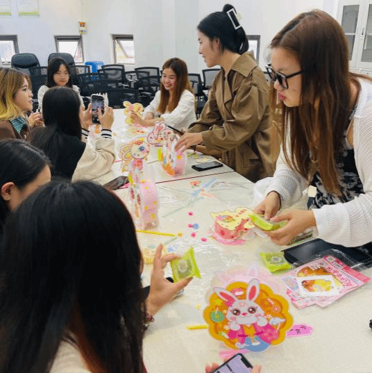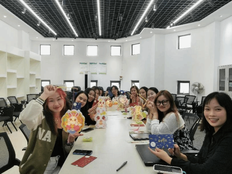 活动开始,同学们讲述了关于中秋节的民间故事,如嫦娥奔月、玉兔捣药等等,并向职工同学们详细讲解了中秋节花灯的起源,告诉她们中秋节花灯与古代祭祀先祖有关。在古代中秋节的时候,人们通过制作花灯来表达对先人的怀念和感恩之情。随后,同学们拿出精心准备的活动材料,开始手把手地教职工同学们制作花灯。花灯制作完成后,同学们纷纷点亮,不同花灯背后还有关于中秋节物品的字谜,在欢声笑语中让职工们对节日的印象和理解更加深刻。活动最后,大家还一起参与了词语接龙的趣味小游戏,有趣又有“营养”,有助于提升职工们读、记汉字的能力。活动现场气氛活跃,拉进了不同国籍同学们之间的距离,也让职工们更深刻地了解了中华优秀传统文化。