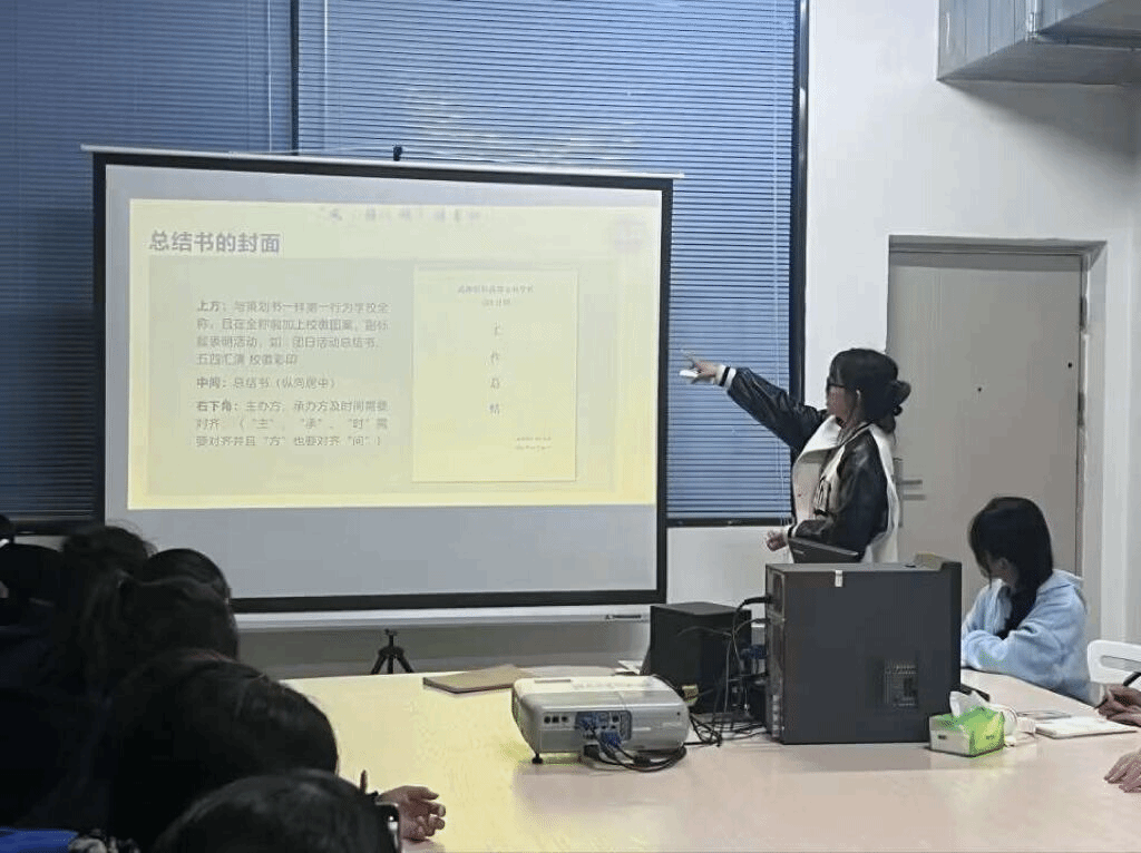 培训会上,团支书公兰淇给社员们全面细致介绍了策划书撰写格式、用语及排版等相关要求。面对新社员对计算机基础普遍不熟悉的情况,副社长黄振新化繁为简,有针对性地将平时实际工作使用频率最高的标题、段落格式和表格等重点操作技能进行讲解。在PPT制作方面,黄振新详细讲解并演示了多种图片处理、SmartArt运用、幻灯片母版等能够便利PPT制作和美化幻灯片的方法。