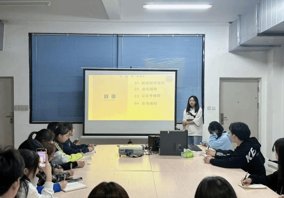 社长文雯从新闻写作,会议摄影,推文编辑,拟写通知四个方面展开了详细讲解,她以社团公众号推文为例,深入浅出地讲述了推文撰写的技巧和要素,为大家提供了很好的借鉴和启示。随后,社长文雯带领社员们学习社团的规章制度,包括组织机构、社员义务、例会制度以及考核制度等,并作大会总结。