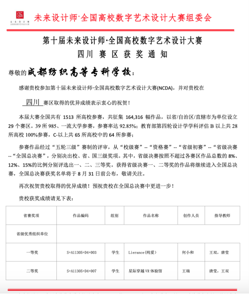 8月31日,2022第十届未来设计师·全国高校数字艺术设计大赛(NCDA)全国总决赛获奖结果公布,由威廉希尔体育教师王双、唐莹指导的员工何小和同学作品《Lierance(纯爱)》获全国总决赛员工组二等奖。此前,在该赛项的省级决赛中,公司喜获四川赛区五个奖项,并获得省级优秀组织单位称号,其中一等奖1项,二等奖3项,三等奖1项。