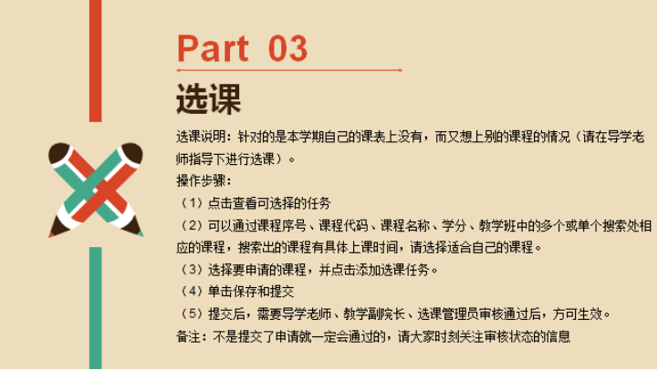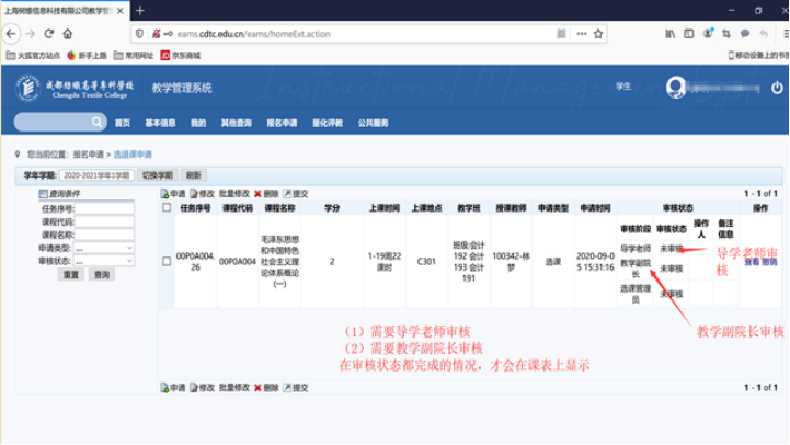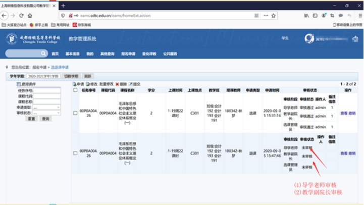 (3)在申请后,请时刻注意审核状态,只有自己的导学老师、教学副经理以及教务处审核管理员审核通过后,方可生效