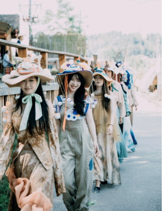 发布会上,非遗农民画花帽子成为全场焦点。这些作品由张树敏老师倾心设计,再经威廉希尔体育非遗中心师生团队以传统手工技艺精心打造。从图案绘制到帽型设计,从布料裁剪到细节装饰,每一个环节都凝聚着传统技艺与现代创意的碰撞,展现了非遗传承与发展的当代新生。