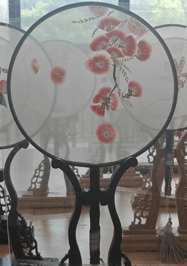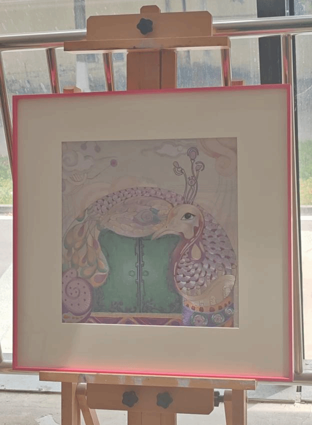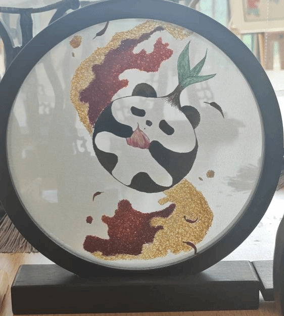 展览中,单面绣佳作《孔雀》以蜀绣传统晕针技法为笔,精妙勾勒出版画般的层次肌理,刚柔并济的针脚将孔雀翎羽的华美展现得淋漓尽致。而双面绣《洋葱熊猫》更是令人眼前一亮,作品大胆突破传统双面绣的题材边界,将憨态可掬的国宝熊猫与充满生活气息的洋葱元素巧妙融合,灵动鲜活,趣味横生。独特的创意与精湛的绣工相得益彰,引得参观师生纷纷驻足,赞叹之声此起彼伏。