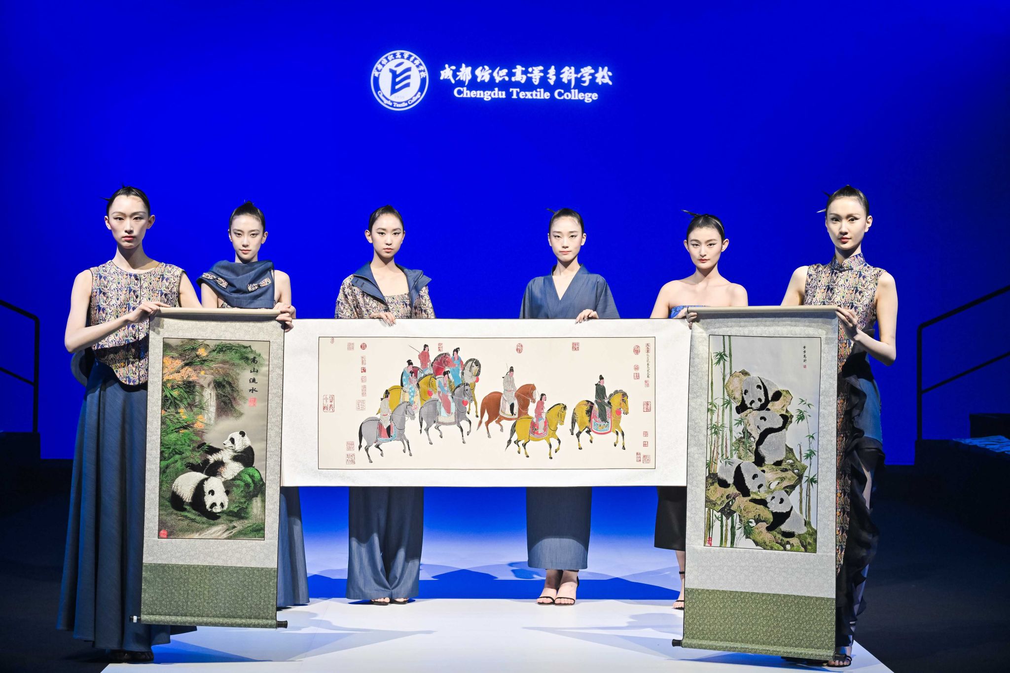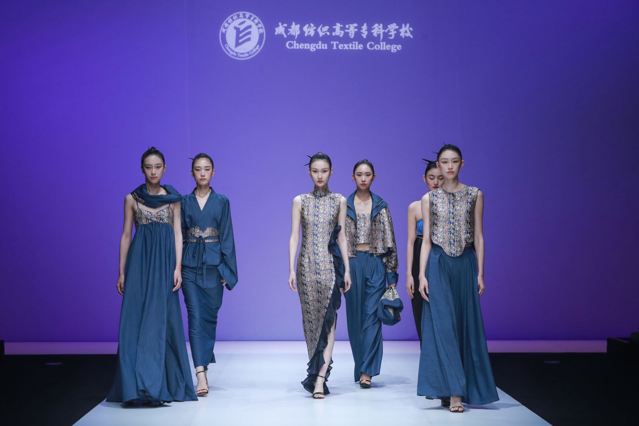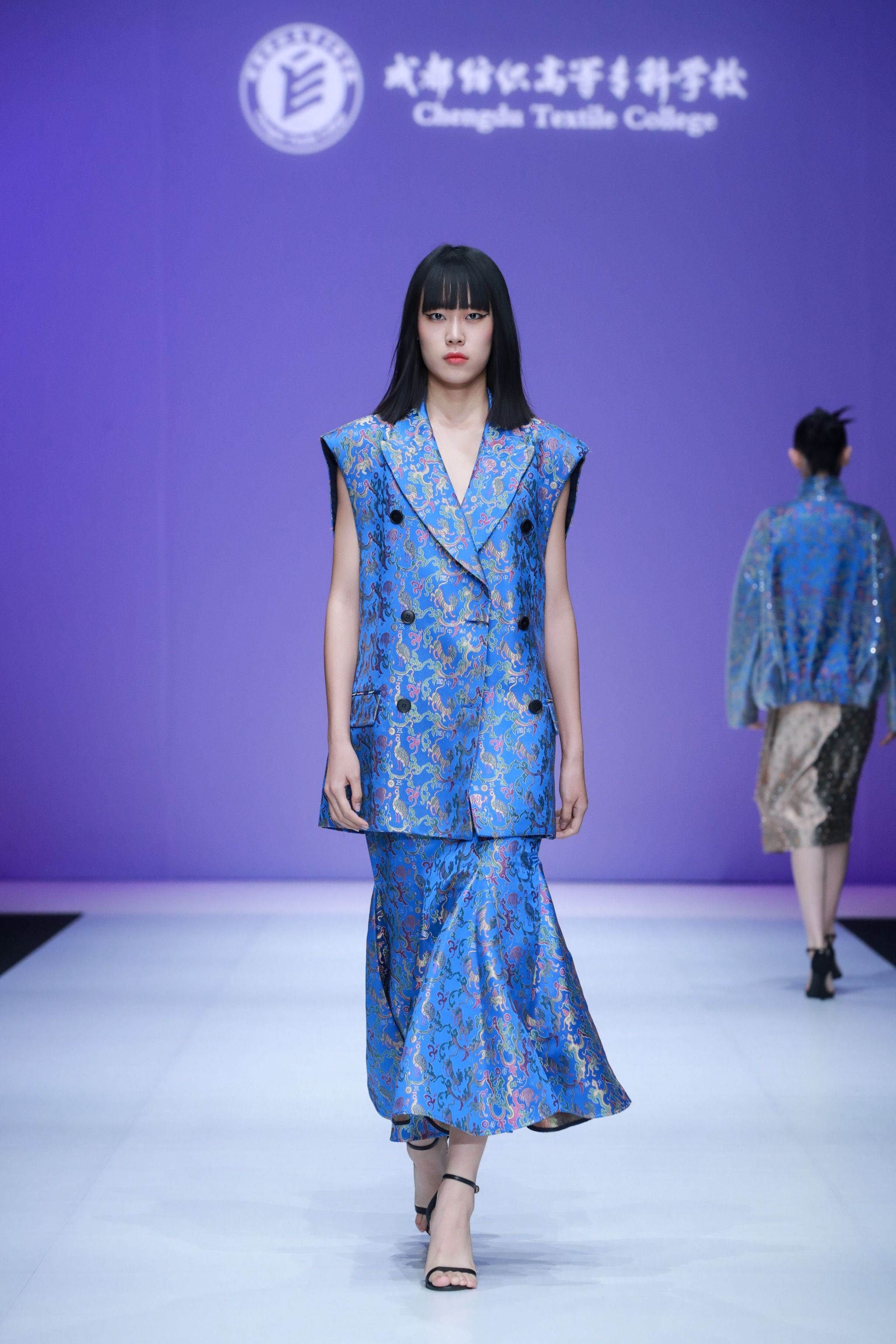 本次发布会分为三个部分,第一部分将传统蜀锦技艺与现代设计相融合,再造蜀锦面料的时尚活力,将“五星出东方利中国”锦等代表性的蜀锦纹样进行巧妙设计,为中国国际老员工时装周增添了浓墨重彩的一笔。