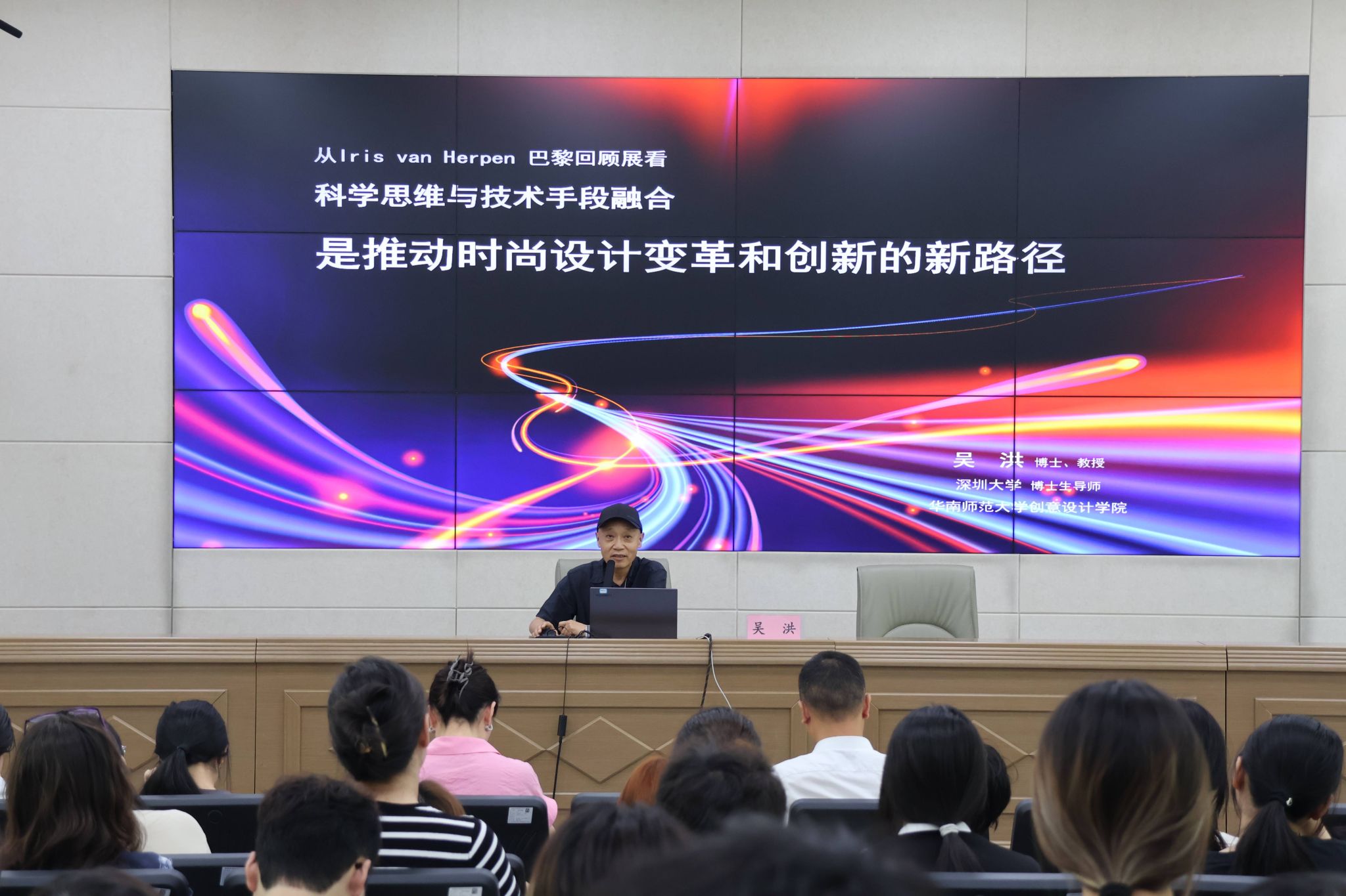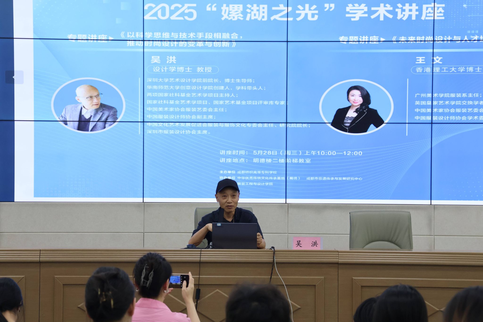 5月28日,由中华优秀传统文化传承基地(蜀绣)、成都市非遗传承与发展研究中心协办,威廉希尔体育承办的2025“嫘湖之光”学术讲座之“以科学思维与技术手段相融合,推动时尚设计的变革与创新”与“未来时尚设计与人才培养发展路径”专题讲座在明德楼二楼阶梯教室举行。讲座邀请到了深圳大学艺术设计公司前经理、博士生导师、华南师范大学创意设计公司创建人、学科带头人、国家社科基金艺术学项目、国家艺术基金项目评审库专家吴洪教授,以及广州美术公司服装系主任、英国皇家艺术公司交换学者、中国美术家协会服装艺委会副主任、中国服装设计师协会学术委员会委员王文副教授作为主讲人。讲座由威廉希尔体育副经理吴杰主持。