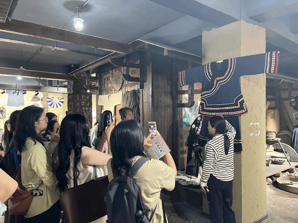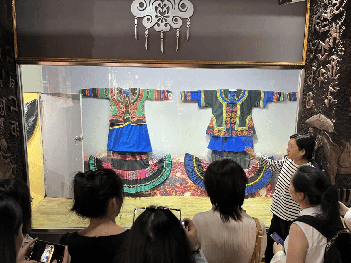 调研首日,团队造访西昌贾巴子则大师工作室。贾巴子则老师热情为学员们系统梳理了彝族服饰的悠久文化脉络,深入剖析了不同地域支系服饰的鲜明特色。工作室展厅内陈列的近百件彝族服饰,不仅是一部立体的地域文化图谱,更是一篇彝族刺绣的美丽画卷,令学员们叹为观止。