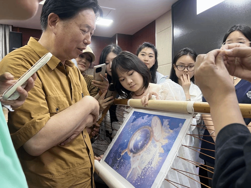 谈及自己的创作心得,吕存大师强调,正则绣不仅是一门精湛的手工技艺,更是表达创作者情感与思想的独特艺术语言。在讲座的互动环节,吕存大师与现场师生展开了热烈交流,耐心细致地解答了关于正则绣针法技巧、创作灵感来源以及未来传承发展路径等问题。他特别指出,刺绣艺术创作需要极大的耐心、细心和恒心,每一针每一线都凝聚着创作者的心血与情感寄托。他深情勉励在座学子,要深入了解博大精深的中国传统文化精髓,以饱满的热情投身于刺绣技艺的传承事业中,同时更要秉持积极的创新精神,为这门古老艺术的持续繁荣发展贡献青春力量。