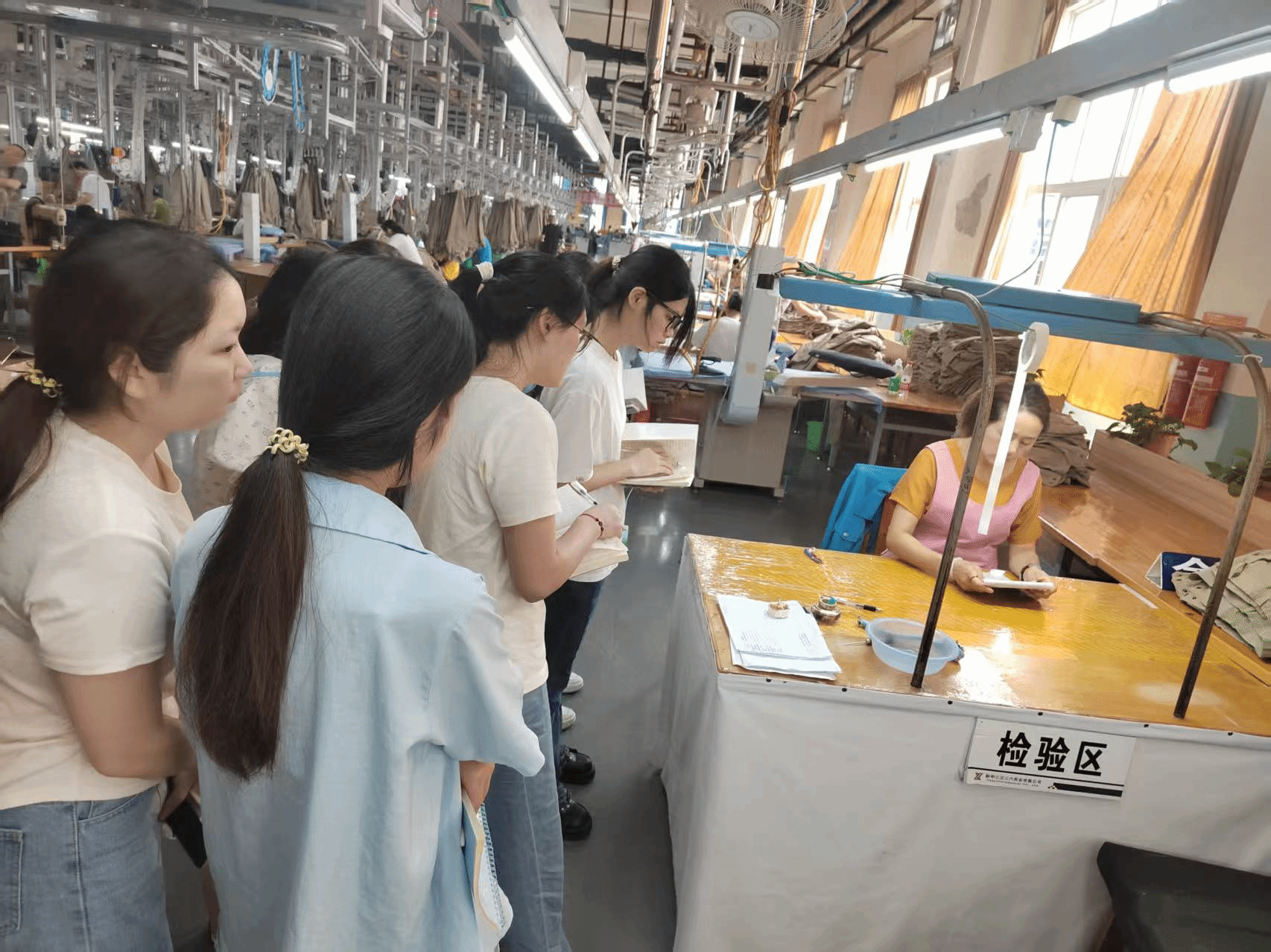 本次实习精准覆盖企业核心流程,员工们先后深入六个关键部门:在研究分院剖析研发逻辑与样衣成型,技术部研习工艺与生产前准备,质检部掌握产品检验规程,一车间操作验布、裁剪及粘合,二车间体验缝纫产线管理与人力调度,生产部洞悉订单计划与全流程跟踪。全程企业导师全程定制化指导,将复杂工艺转化为可触达的技能阶梯,吴煜君教师凭借其丰富的教学经验及在多家企业的挂职锻炼背景,从专业指导到生活关怀为员工提供了坚实保障。值得一提的是,吴老师自2012年首次带队赴际华3536实业有限公司实习以来,见证并推动了校企合作的深化。