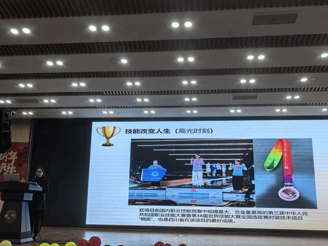 优秀员工代表、第48届世界技能大赛时装技术项目全国铜奖获得者罗敬分享了自己的成长历程。从母校的实训车间到全国大赛领奖台,从一名中职生到成为一名职业院校教师,她以亲身经历诠释了“技能改变人生”的真谛,并勉励学弟学妹珍惜时光、苦练基本功、勇敢追逐梦想。