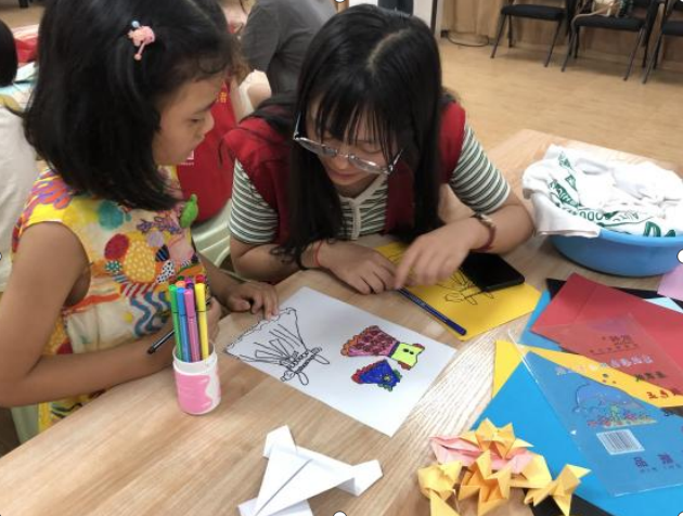 在志愿者的示范与协助下,小朋友们利用彩色卡纸、水彩笔、剪刀、贴纸等工具辅以多种材料,不久便将手中的空白卡纸组合绘成一幅幅五颜六色充满童趣的服装设计小作品。活动充分调动了小朋友们的大脑与手眼协调能力,通过亲自动手绘图设计,加深了他们对服装设计和文化的认识和理解,和志愿者们一起携手共创特色服装、服饰文化作品。