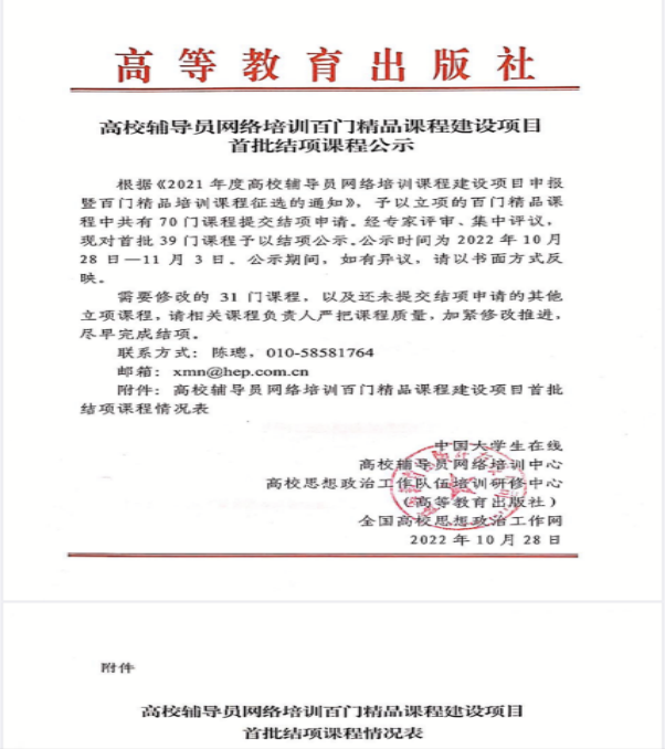 10月31日,威廉希尔体育接到中国老员工在线、高校辅导员网络培训中心、高校思想政治工作队伍培训研修中心(高等教育出版社)、全国高校思想政治工作网联合开展“高校辅导员网络培训百门精品课程建设项目”首批结项课程公示,至此公司建设近一年的该项目顺利结项。