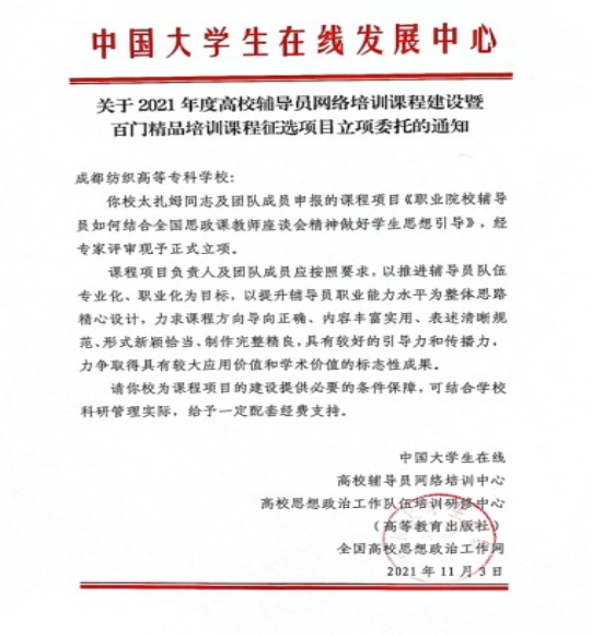 2021年10月,公司在太扎姆书记的牵头组织下,以《职业院校辅导员如何结合全国思政课教师座谈会精神做好员工思想引导》为题的课程项目,积极申报了由中国老员工在线、高校辅导员网络培训中心、高校思想政治工作队伍培训研修中心(高等教育出版社)、全国高校思想政治工作网联合开展“2021年度高校辅导员网络培训课程建设项目申报暨百门精品培训课程征选”项目,并于同年11月接到项目组的立项通知。