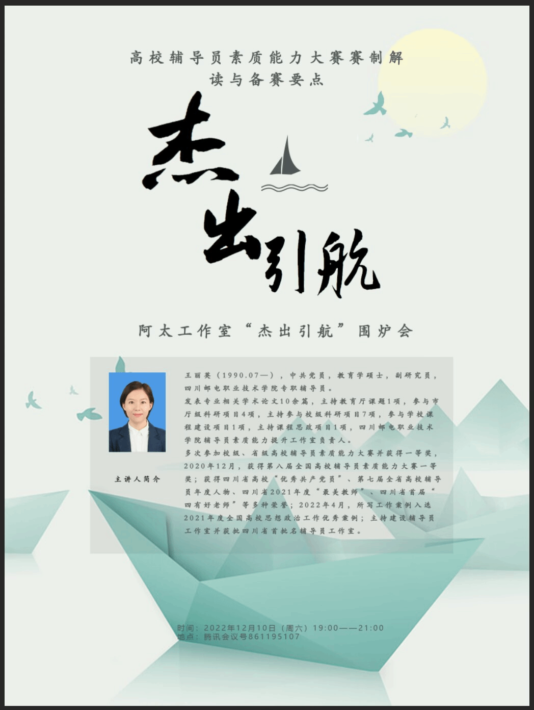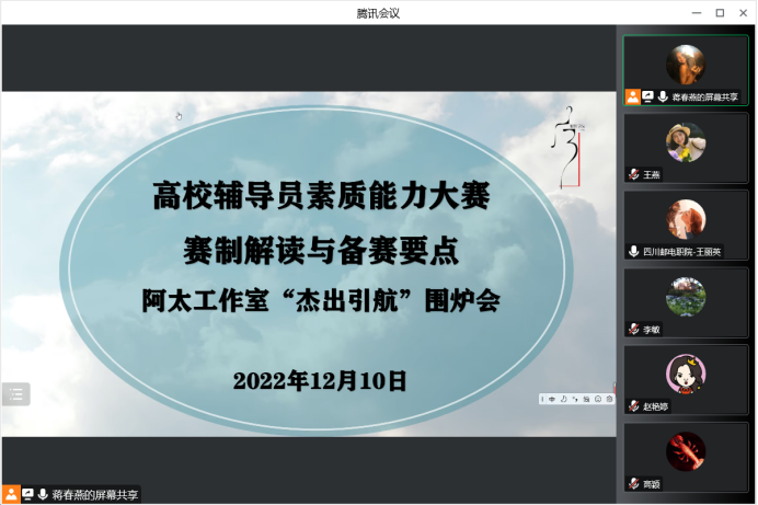 12月10日晚,公司阿太工作室特邀第八届全国高校辅导员素质能力大赛一等奖获得者、四川邮电职业技术公司专职辅导员王丽英副研究员在腾讯会议为公司辅导员开展了一次主题鲜明的专题培训会。