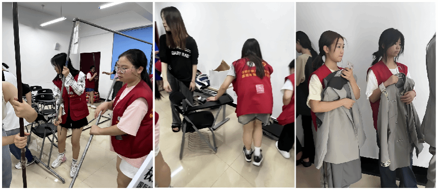 经过公司前期的选拔、培训,志愿者同学们已明确各自分工和职责,以饱满的热情投入到志愿服务活动中。完成各项准备工作后,在作品秀开始前一两天,志愿者同学们便早早到达了现场,积极投入到模特人台与时装作品的搬运、场地的布置和搭建等工作中去。