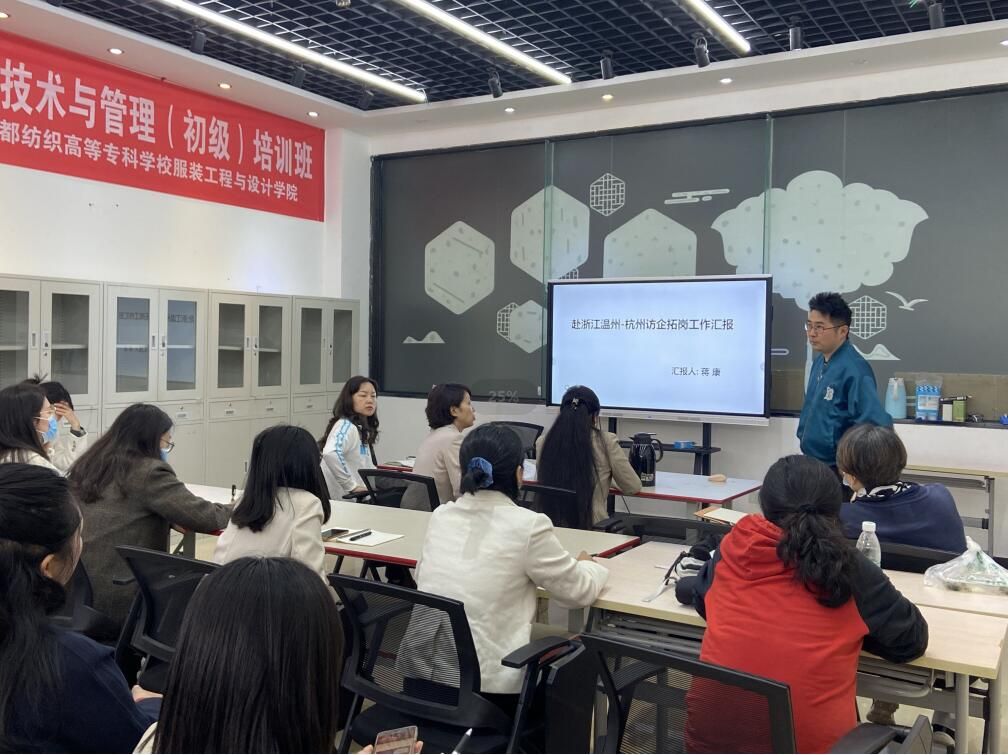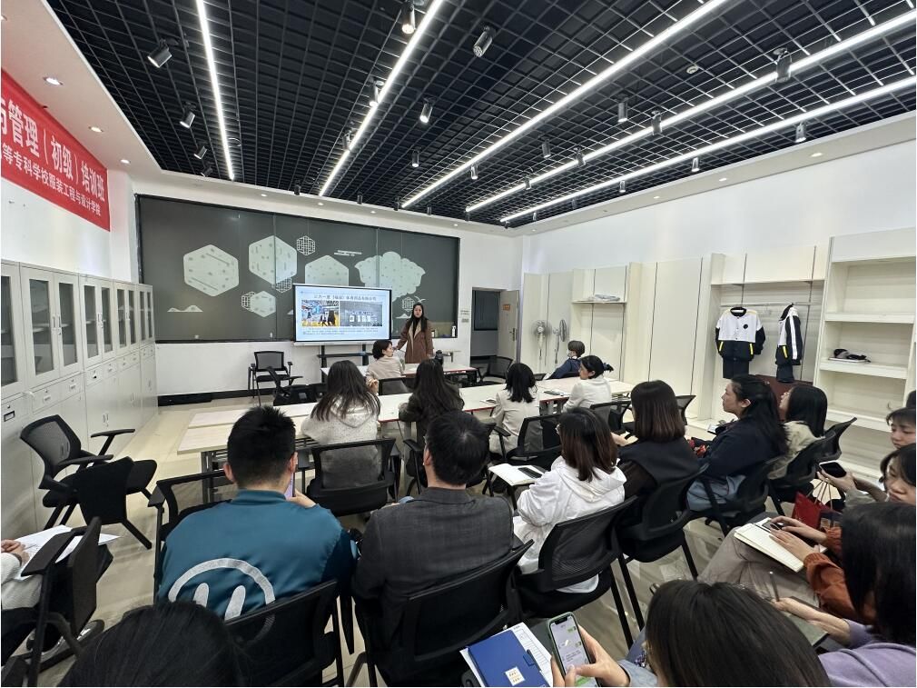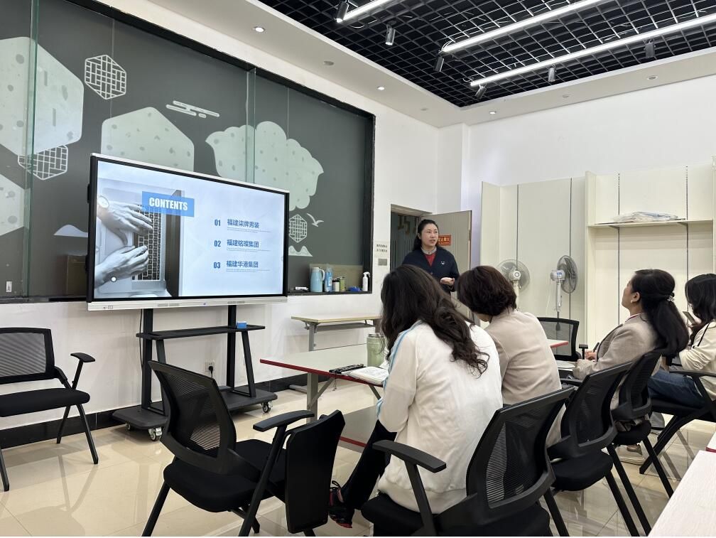 吴煜君副教授首先就赴福建优质纺织服装企业走访进行了分享,其一行先后深入福建柒牌、铭灿集团、宏港纺织、航港针织等企业开拓就业岗位、深化校企合作,促进毕业生更加充分更高质量就业。在柒牌生产管理经理的带领下,老师们参观了服装制版车间、裁剪车间、缝纫车间、整烫车间、包装车间、员工食堂、公寓等,随后进行了调研座谈。调研座谈会上,公司采购总监、党委书记周利对公司积极搭建校企合作和人才就业对接平台表示感谢,吴杰副经理也表示希望继续和柒牌这种优质企业加强联系,深化校企合作,推进产教融合,服务中国服装行业的发展。