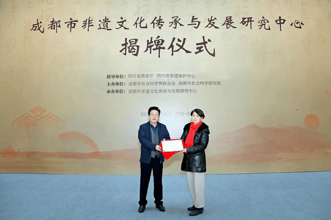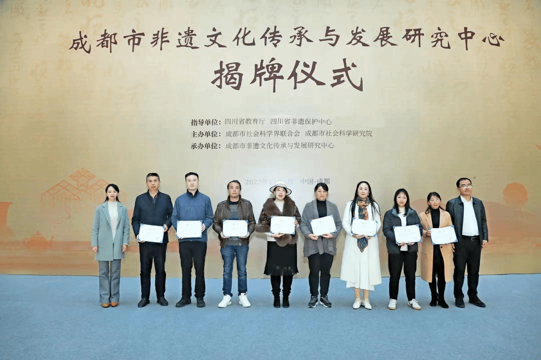 揭牌仪式上,成都市非遗文化传承与发展研究中心的学术委员会成员和“中心”流动研究员接受聘任并被授予聘书。