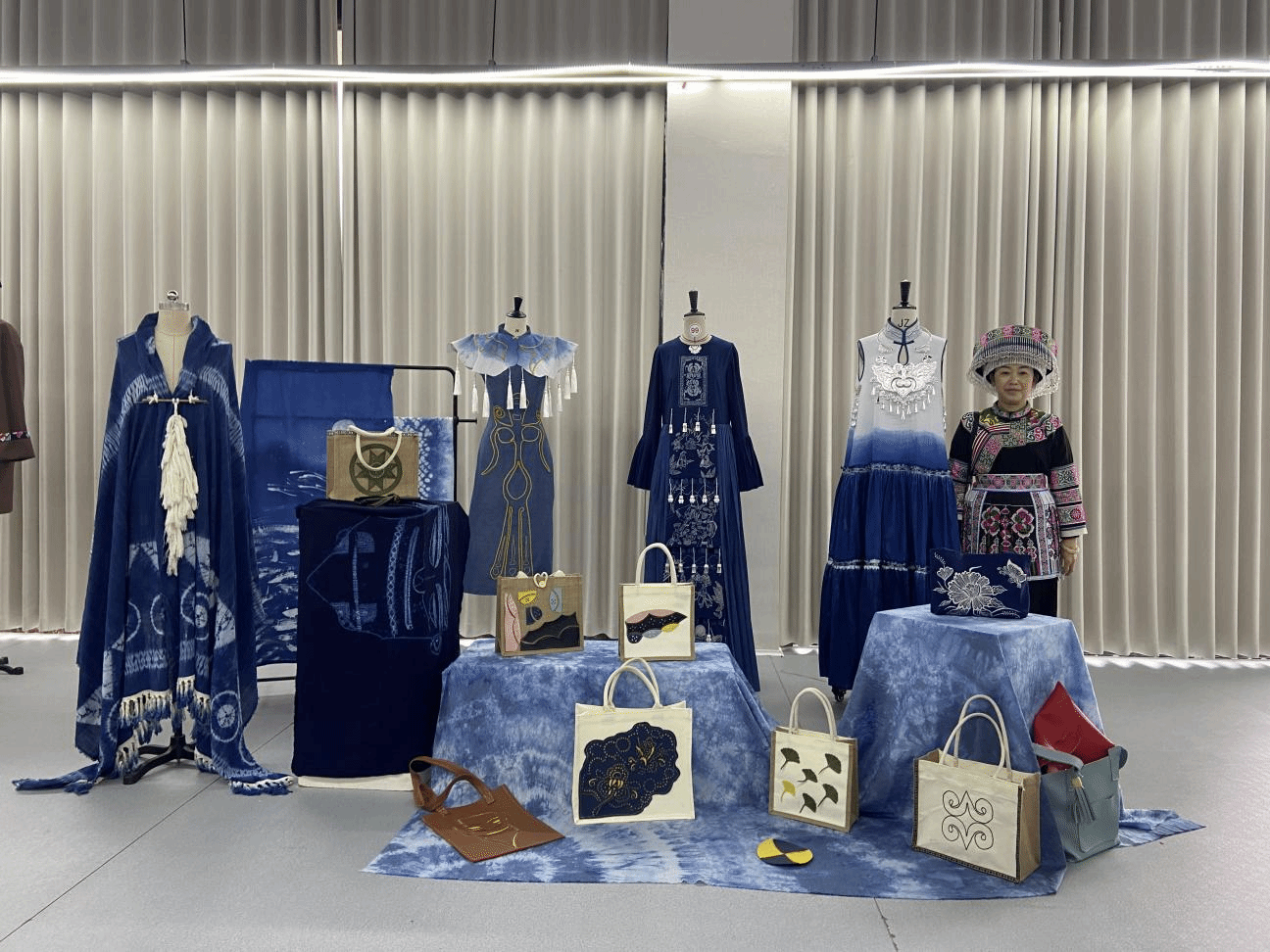 苗族传统技艺蜡染设计作品。苗族传统技艺蜡染设计作品在服装设计上,运用苗族传统技艺蜡染表现苗族迎客习俗,布料采用板蓝植物染料,结合现代时尚设计手法,使服装更具文化气息,彰显非遗魅力。